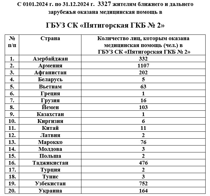 Иностранному гражданину стационарная медицинская помощь при заболеваниях и состояниях, представляющих угрозу жизни пациента, предоставляется бесплатно до выхода из этого состояния, далее по оплате фактической стоимости услуг. Для плановой госпитализации необходимо: - письменные гарантий исполнения предоплаты медицинских услуг исходя из предполагаемого объема предоставления этих услуг; - клинический анализ крови (давностью не более 30 дней); - биохимический анализ крови (давностью не более 30 дней); - маркеры на RW, ВИЧ и гепатиты (давностью не более 30 дней); - общий анализ мочи (давностью не более 30 дней); - ЭКГ (давностью не более 30 дней); - флюорография (давностью не более 30 дней); - для женщин при возможности – осмотр гинеколога (давностью не более 30 дней); - при наличии сопутствующей патологии – заключение профильного специалиста (давностью не более 30 дней). Противопоказанием к госпитализации в стационар ГБУЗ СК «Пятигорская ГКБ № 2» являются: - острые заболевания почек, и урогенитальной сферы с необходимостью хирургического вмешательства; - заболевания нервной системы и состояния, требующие госпитализацию в специализированные лечебные учреждения; - другие хирургические заболевания, требующие наблюдения и лечения в специализированном стационаре.